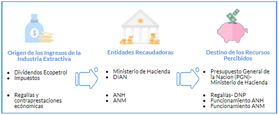 Las principales fuentes de ingresos que genera la actividad extractiva al Estado colombiano son generadas por el pago de impuestos y regalías. Los impuestos son recaudados por la Dirección de Impuestos y Aduanas Nacionales (DIAN), unidad administrativa especial adscrita al Ministerio de Hacienda y Crédito Público (MHCP); por lo tanto, dichos ingresos entran al presupuesto general de la nación (PGN). Las regalías, por su parte, son recaudadas por las agencias nacionales de hidrocarburos y minería, según corresponda, y transferidas al Sistema General de Regalías (SGR).
