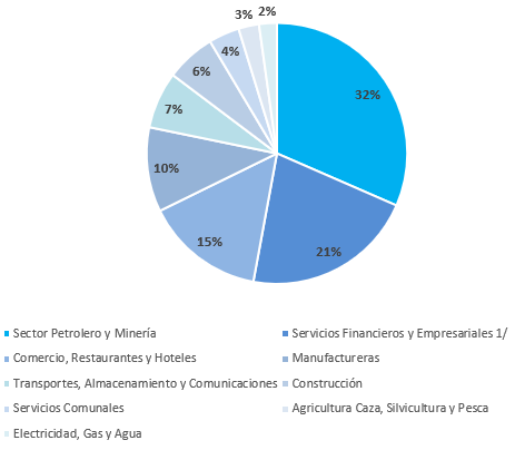 La distribución por actividad económica de la IED recibida en este período fue la siguiente: minería y petróleo (31,9%), servicios financieros y empresariales (20,6%), comercio y hoteles (14,7%), industria manufacturera (10,7%), transporte y comunicaciones (8,6%), electricidad (2,1%), y el resto de los sectores (11,4%).