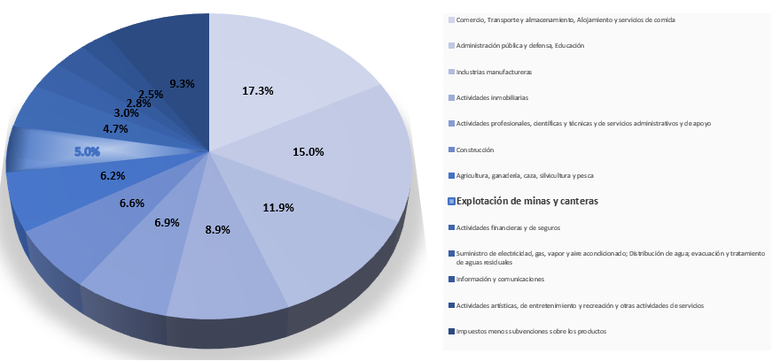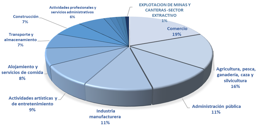 En la gráfica siguiente se puede observar la proporción del total de ocupados a nivel nacional por rama de actividad económica. De acuerdo con las cifras del DANE, la rama de actividad de Minas y Canteras corresponde al sector extractivo participa en 1% equivalente 196 mil personas ocupadas.