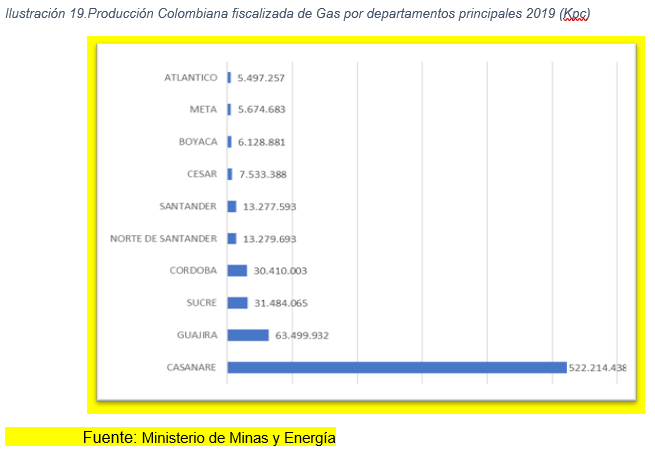 Ilustración Producción Colombiana fiscalizada de Gas por departamentos principales 2019 (Kpc)