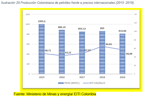 Ilustración Producción Colombiana de petróleo frente a precios internacionales (2015 -2019)