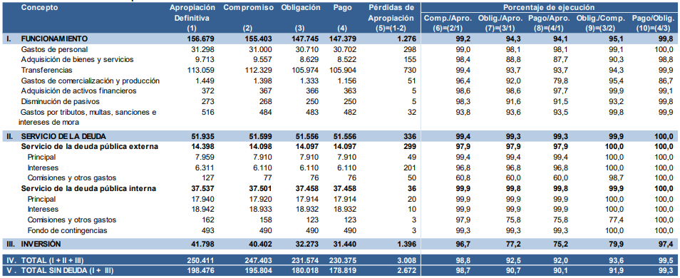 A diciembre de 2019, el total de compromisos asumidos por las entidades que forman parte del PGN ascendió a $247,4 billones, correspondientes al 98,8% de la apropiación definitiva de 2019. Las obligaciones, por su parte, ascendieron a $231,6 billones, correspondientes al 92,5% de la apropiación definitiva y al 93,6% del monto comprometido para el mismo período. En lo que respecta a los pagos, éstos sumaron $230,4 billones, correspondientes al 92% de la apropiación definitiva y al 99,5% de las obligaciones adquiridas, como se presenta en la tabla