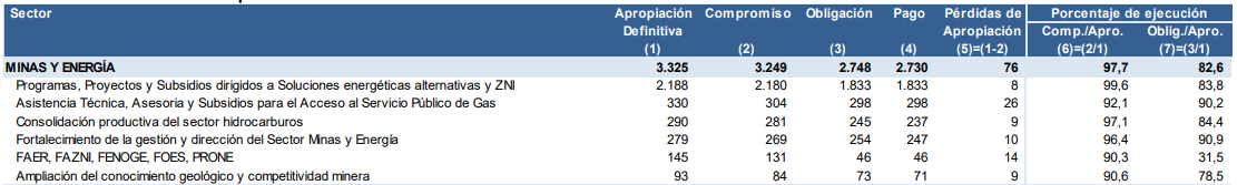 En la siguiente tabla se puede ver el gasto en inversión en el rubro de Minas y Energía: