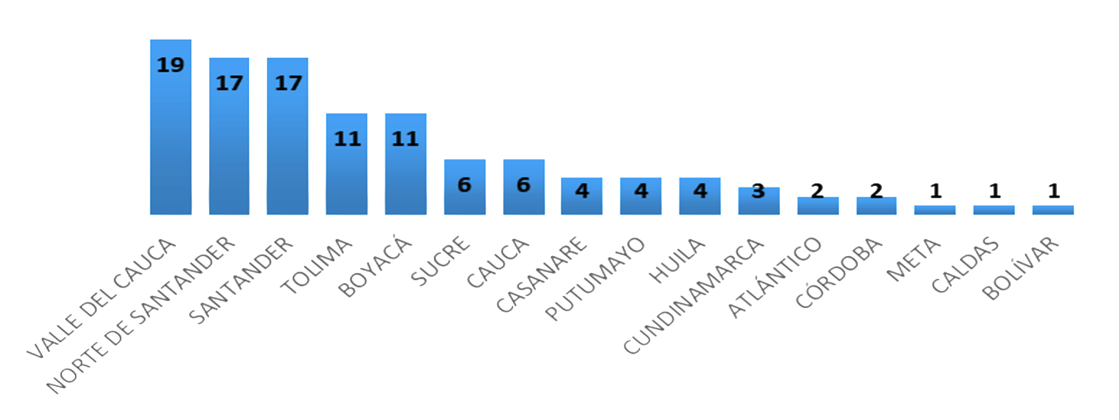 Los planes de gestión social aprobados a 31 de diciembre de 2021 se concentran en los departamentos de Valle del Cauca, Norte de Santander, Santander, Tolima y Boyacá, con un 69 %, seguidos de Sucre, Cauca, Casanare, Putumayo y Huila con un 22 % y Cundinamarca, Atlántico, Córdoba, Meta, Caldas y Bolívar con un 9 %.