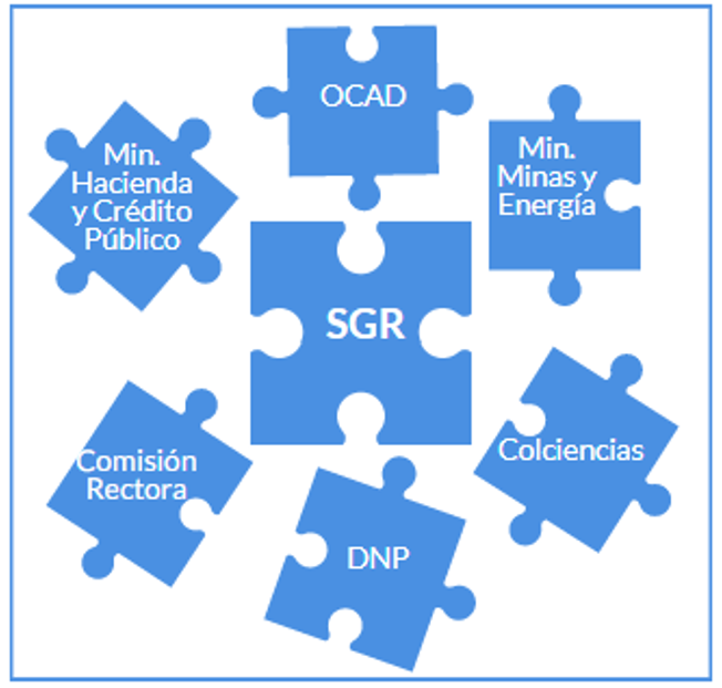 El SGR está conformado por la Comisión Rectora, el Departamento Nacional de Planeación, los ministerios de Hacienda y Crédito Público, y de Minas y Energía; así como sus entidades adscritas y vinculadas que cumplan funciones en el ciclo de las regalías; el Departamento Administrativo de Ciencia, Tecnología e Innovación (Colciencias), y los Órganos Colegiados de Administración y Decisión (OCAD).