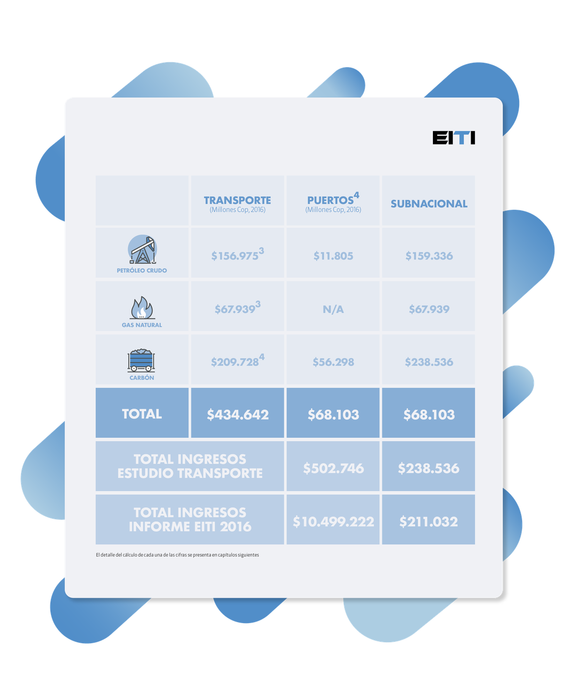 Los tres conceptos representan un ingreso para el Estado Colombiano de aprox. 502.746 millones de COP. Lo que equivale un 4,8% del total de ingresos del sector de la industria extractiva (Informe EITI 2016).