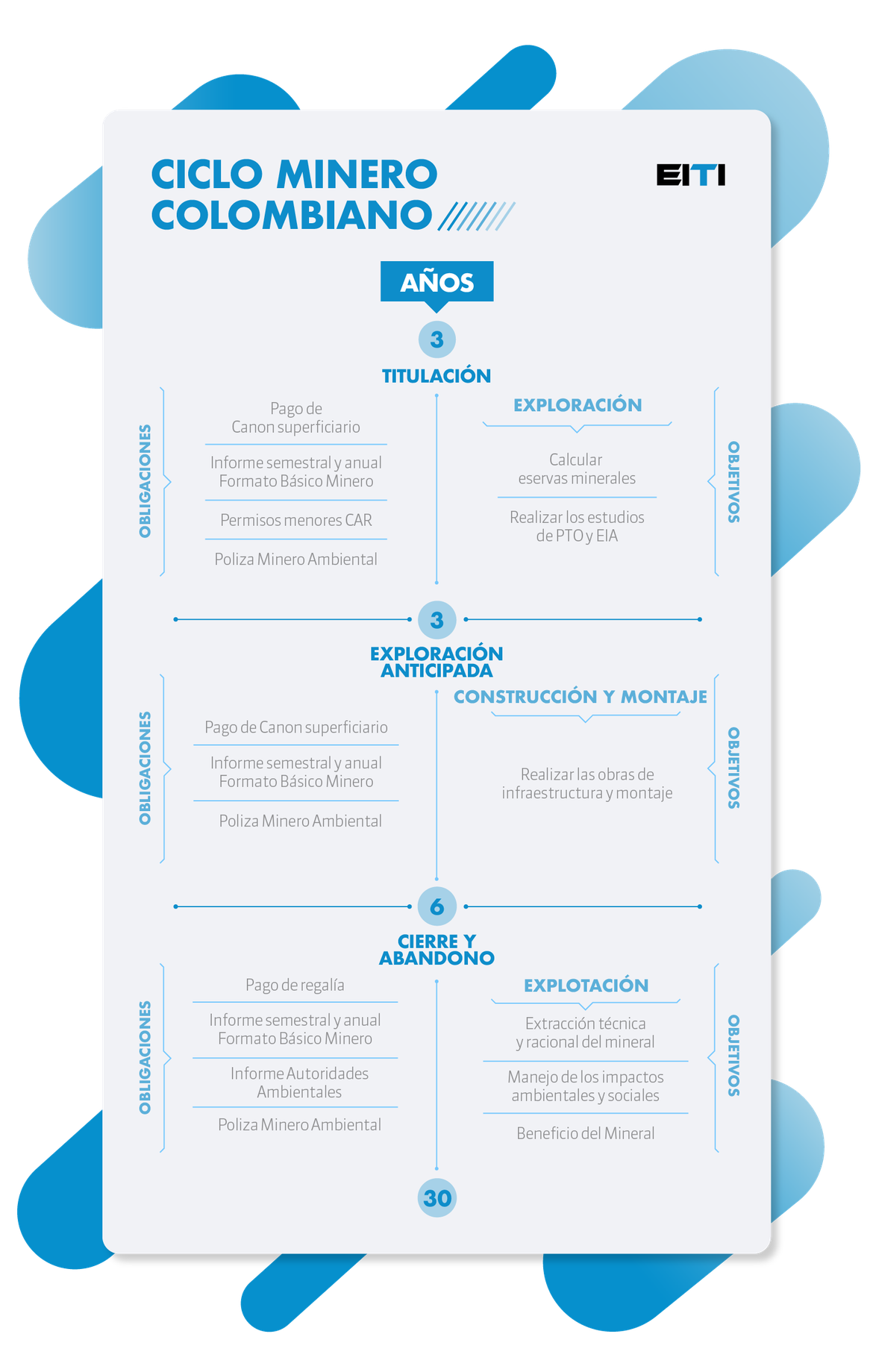 El sector minero colombiano se caracteriza por la producción de varios minerales, como el carbón (térmico, metalúrgico y antracitas), mineral de níquel, hierro, cobre, metales preciosos (oro, plata, platino), esmeraldas y materiales para la industria y la construcción. Su desarrollo se concibe en cuatro etapas: exploración, construcción y montaje, explotación y cierre, y abandono (Ley 685 de 2001, Código de Minas). En el esfuerzo del país por diseñar políticas públicas diferenciales, este sector se encuentra clasificado en minería pequeña, mediana y de gran escala (figura 3).