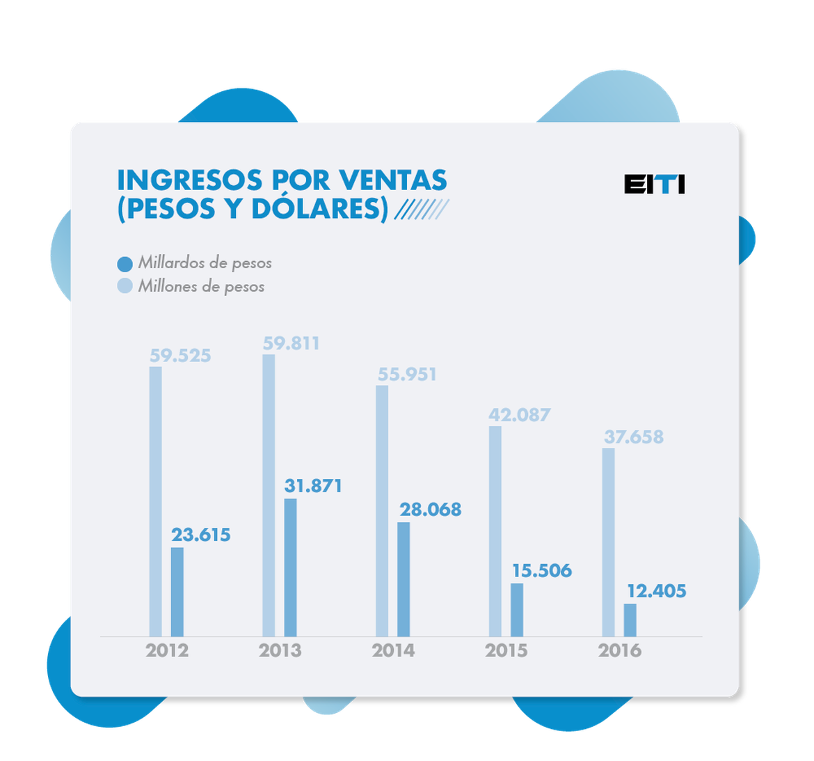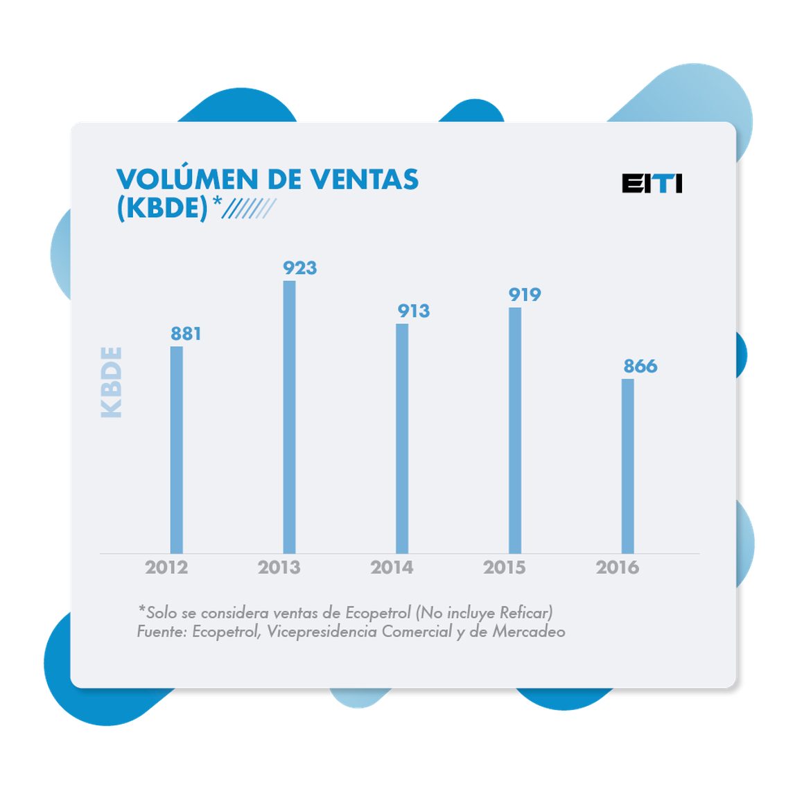 En 2016 se vendieron 866 Kbde, así: 487 Kbd de crudos, 292 Kbde de productos y 87 Kbde de gas natural. Frente al año anterior, se observó una reducción en las ventas de 53 Kbde, explicada principalmente por la menor producción de crudo.