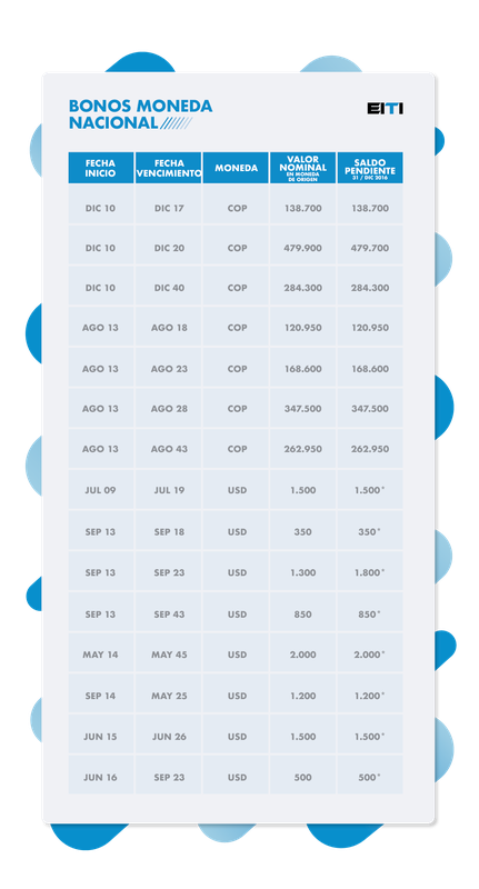 En 2016 la compañía realizó emisión de bonos internacionales con vencimiento en septiembre del 2023 por USD $500millones, con pago de capital al vencimiento e intereses pagaderos semestralmente a una tasa cupón de 5.875%. El nuevo monto vigente total del bono es de US$1,800 millones. A continuación se relacionan