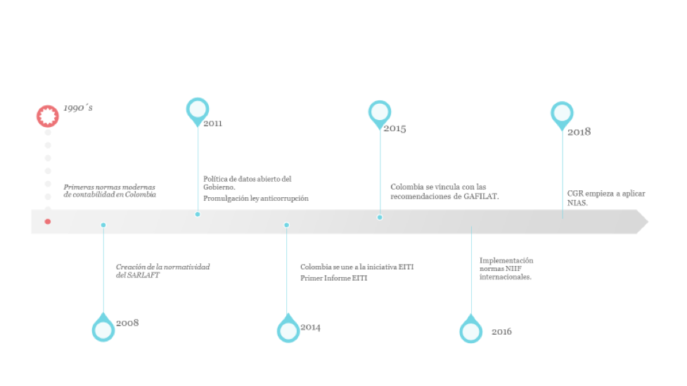Para ilustrar mejor la evolución de las normas que han favorecido a la garantía de la calidad de los datos, y que son un parte de seguridad para los procesos y principios del EITI, a continuación, se presenta una línea de tiempo. Esta línea de tiempo ubica temporalmente los momentos hitos, en materia regulatoria, en relación con la transparencia y calidad de los datos.